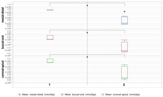 Box plots showing tooth growth in minipigs not administered ZOL (1) and minipigs administered ZOL (2). Asterisk indicates statistically significant differences (p ≤ 0.05).
