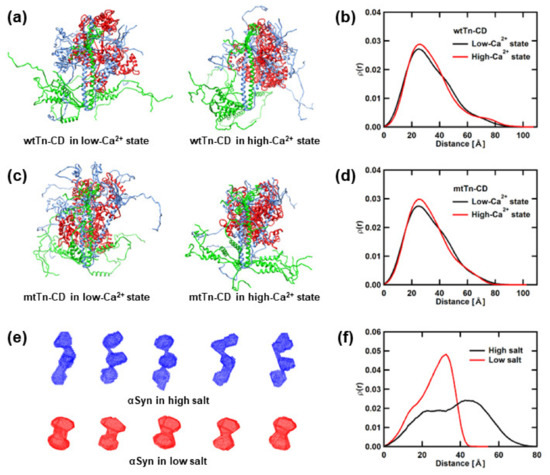 Summary of the structural models. (a,c) Gallery of examples of the structural models of the wtTn-CD and the mtTn-CD, respectively. A total of 10 models, arbitrarily selected from the ensembles of 1000 models, are superimposed so that the central regions observed by the crystal structure coincide. (e) Gallery of examples of the structural models of αSyn. A total of 5 examples of the dummy-atom models, arbitrarily chosen from the ensembles of 100 models, are shown. (b,d,f) the ρ(r) curves of the wtTn-CD, the mtTn-CD, and αSyn, respectively. Panels (a,c) are drawn using UCSF Chimera [36], and (e) are drawn using PyMOL.