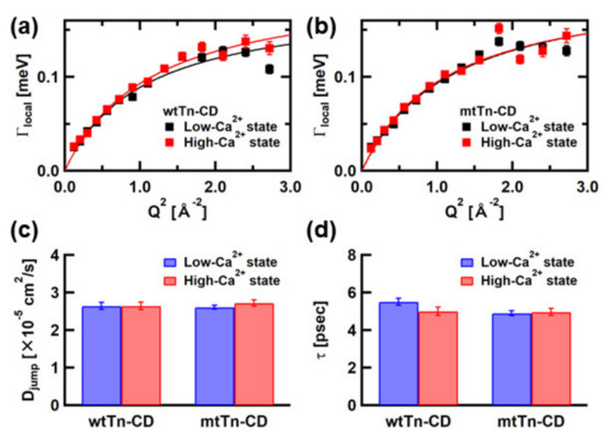 Summary of Q2-dependence of Γlocal of (a) the wtTn-CD and (b) the mtTn-CD, and summary of the parameters, (c) Djump, and (d) the residence time, obtained from the fits with the equation based on the jump-diffusion model to the plots in (a,b). Error bars within the symbols are not shown.