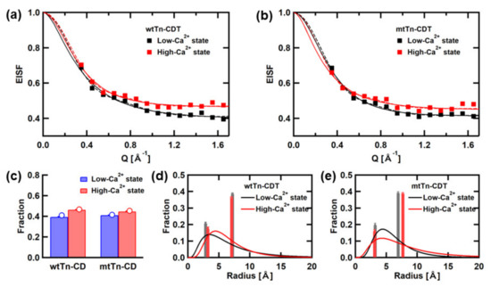 where p0 is the “immobile” fraction, and p1 and p2 are the fractions of atoms undergoing diffusive motions within the spheres of radii a1 and a2, respectively (p0 + p1 + p2 = 1). As shown in Figure 5, similar values of the fraction of the “immobile” atoms are obtained from the analyses using both models. Furthermore, the distributions of the radii of spherical spaces in which the atoms undergo diffusive motions appear to be consistent between the two models. Thus, the analyses of the EISF curves using Equations (6) and (7) yield consistent results. Differences between the wtTn-CD and mtTn-CD are observed in the radial distribution of the mobile fractions. In the wtTn-CD, the peak position in the distribution shifts to a larger value, and the width of the distribution is narrower in the high-Ca2+ state than in the low-Ca2+ state, whereas in the mtTn-CD, the peak position remains similar, but the width widens. Taken together, in the wtTn-CD, the rates of the local motions become faster, and their amplitudes become larger, but their distribution becomes narrower in the high-Ca2+ state. On the other hand, in the mtTn-CD, the rates of the local motions do not change, but the distribution of the amplitudes of the local motions becomes wider.