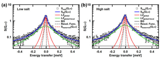 Examples of the QENS spectra. The spectra at Q = 1.05 Å−1 of αSyn (a) in the low-salt state, and (b) in the high-salt state, are shown. The fits to the experimental spectra using Equation (1), the simulated spectra of Strans+rot(Q,ω), and the resolution function are also shown. The experimental spectra shown were obtained from the measurements carried out during the study described in [14].