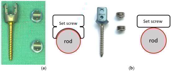 - Ardura, F.; Chenaux, D.; Pascal-Moussellard, H.; Hessmann, M.H. Evaluation of the reduction, tightening and gripping performance of an innovative set screw technology for instrumented posterior lumbar fusion: A biomechanical study. Orthop. Traumatol. Surg. Res. 2021, 107, 102918. [Google Scholar] [CrossRef]