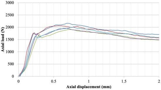 Sample testing curve for axial slip testing showing five test runs for a group.