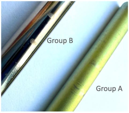 Dynamic mechanical testing was performed on 11 bilateral constructs of each device, in total consisting of 44 pedicle screws and 22 rods. Blocks of ultra-high molecular weight polyethylene (UHMWPE) were formed according to ASTM F1717. As shown in Figure 2b, two screws were secured in each block and linked by rods to simulate fixation between two adjacent vertebrae. The constructs (rods and screws) were set up according to the manufacturer’s instructions using standard surgical instruments. The active length was 76 mm, and the moment arm from the centerline to the insertion point was 40 mm on the x-axis and 20 mm on the y-axis. Set screws were tightened at three different torque values to simulate standard insertion (manufacturer recommended), over-tightening by 1 Nm and under-tightening by 1 Nm. Dynamic compression bending tests were performed on both constructs according to the methods described in ASTM F1717 []. All tests were conducted in dry air at room temperature. For the dynamic fatigue test, the frequency was set at 5 Hz with a cyclic sine wave. The R value (minimum load divided by maximum load) was 10. The test was ceased when the sample failed (meaning any permanent deformation that altered the functional performance), the distance between the test blocks was reduced to less than 38 mm, or when 5,000,000 cycles (run-out) were reached. The load applied and the duration of loading were recorded to determine the fatigue strength. ASTM F1717 recommends that loading commences at 50% of the ultimate load, which in this study was determined to be 340 N and 355 N for Group A and B by using a preliminary static test. Therefore, loading started at 170 N for both groups and was increased after every third sample until permanent deformation or functional failure occurred, or the number of cycles exceeded 5,000,000 cycles. Otherwise, the load level was decreased every third sample until sample run-out. The fatigue strength for both Group A and B was 190 N when torquing the set screw to the manufacturer’s recommended specification.