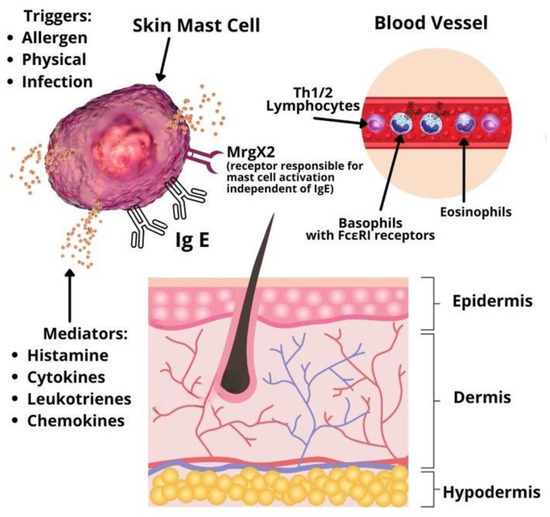Urticaria is considered a disease driven mainly by mast cells [1]. Symptoms develop due to mast cell and basophil degranulation, followed by the release of various types of mediators: Preformed (histamine, serotonin, tryptase, proteoglycans, etc.), newly synthesized lipid mediators (prostaglandins, cysteinyl leukotrienes, etc.), cytokines and chemokines (IL-4, IL-5, IL-6, TNF-alpha, TNF-beta, etc.) [3]. Mast cells and basophils activation may be immunoglobulin E (IgE) or non-IgE mediated. In addition, studies for other infiltrating cells involved in the pathophysiology of CSU, such as lymphocytes and eosinophils, are emerging (Figure 1). A significant role in type I allergic reactions has the platelet-activating factor (PAF) produced and released by mast cells, eosinophils, basophils, endothelial cells, neutrophils, platelets, fibroblasts, and even the cardiac muscle [4]. Mast cells can produce and be activated by PAF. When the mast cells are located in the skin, exposure to PAF leads to degranulation of their granules via neuropeptides [5]. Therefore, PAF plays an essential role in patients with urticaria due to its inflammatory role and chemotactic action. Along with the vascular endothelial growth factor (VEGF), PAF increases the permeability of capillaries in the skin and intensifies the development of urticarial specific lesions, such as wheals and erythema. This effect is especially distinguishable in chronic spontaneous urticaria. Studies on volunteers with CSU revealed that PAF injected subcutaneously induces typical urticarial hives [3]. Studies on anaphylaxis have shown that PAF is an important mediator in the development of anaphylactic shock. High serum levels of the platelet-activating factor directly influence the severity of systemic reactions [4,5].