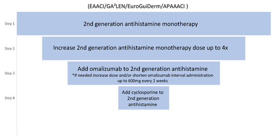 In accordance with the current international EAACI/GA2LEN/EuroGuiDerm/APAAACI guidelines for the management of chronic spontaneous urticaria, a four-step treatment algorithm is recommended (Figure 2). Following an inadequate response to the first and second lines of treatment with H1-antihistamines at licensed dose or up to 4 times the licensed dose, respectively, patients may be offered omalizumab as the third line of treatment [1]. Immunosuppressants, such as cyclosporine are administered to patients that are nonresponsive to omalizumab due to a higher incidence of adverse effects. Studies comparing the efficacy of omalizumab to cyclosporine showed the superiority of the first [13]. Moreover, in contrast to cyclosporine or montelukast, omalizumab is a licensed treatment for chronic urticaria [11].