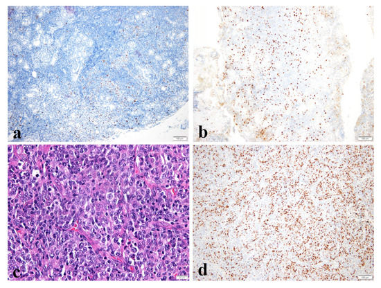 - Petit, B.; Chaury, M.P.; Le Clorennec, C.; Jaccard, A.; Gachard, N.; Moalic-Judge, S.; Labrousse, F.; Cogne, M.; Bordessoule, D.; Feuillard, J. Indolent lymphoplasmacytic and marginal zone B-cell lymphomas: Absence of both IRF4 and Ki67 expression identifies a better prognosis subgroup. Haematologica 2005, 90, 200–206. [Google Scholar] [PubMed]