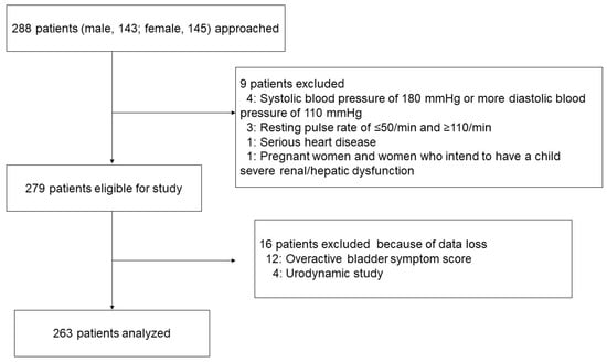 A total of 263 patients, comprising 131 men and 132 women who fulfilled the criteria for OAB, were enrolled in the study (Figure 1). As shown in Table 2, the mean age was 73.1 ± 11.6 years. The mean SBP and DBP before treatment were 127.5 ± 16.2 mmHg and 71.2 ± 11.4 mmHg, respectively, and the mean PR was 74.5 ± 12.1/min. Prior to this study, 128 patients (48.7%) had hypertension. All hypertensive patients were prescribed antihypertensive drugs. There was no significant difference between the two groups in the proportion of the types of antihypertensive agents used (p = 0.912) (Table 2). In addition to age, the proportion of men in the old group was significantly higher than in the young group (p < 0.001). Benign prostatic hyperplasia was diagnosed before the start of this study in 94 (71.8%) male patients with OAB, although there was no significant difference in treatment between the two groups (Table 2).