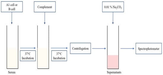 As shown in Figure 1, the serum of patients with blood type O (250 µL) was incubated with the same quantity of prepared A1/B cells (250 µL) for 30 min at 37 °C. Next, we added a complement stock solution (250 µL). After incubation at 37 °C for 2 h, supernatants were collected after 15 s of centrifugation at 2540× g. After mixing with 300 µL of supernatants and 3 mL of 0.01% Na2CO3 (Sigma-Aldrich), free Hb level was measured using a UV-Vis spectrophotometer U-3310 (Hitachi, Tokyo, Japan) at 380–415–450 nm. We used the Harboe equation: free Hb (mg/dL) = {(A415 nm × 2) − A380 nm − A450 nm)} × 83.6 [14,15]. For calculation of hemolysis (%), 100% positive control was made by mixing A1/B cells and PBS (1:2) with freezing and thawing repeated three times for 30 min at −80 °C. Negative control was used, and 0.9% NaCl (250 µL), 3% Affirmagen A1/B cell (250 µL), and human complement serum (250 µL) were prepared as mentioned above.