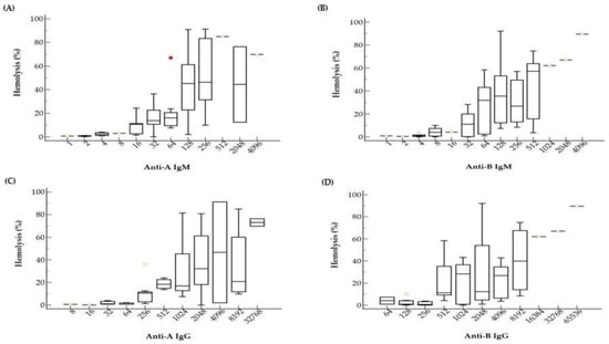 Hemolysis values (%) according to anti-A and anti-B isoagglutinin titers. As the titer increases, the hemolysis% also increased. There are substantial variances in hemolysis% among samples with the same isoagglutinin titers. Box and whiskers plots indicate hemolysis% according to anti-A IgM (A), anti-B IgM (B), anti-A IgG (C), and anti-B IgG (D) titers. The red square indicates an outlier.