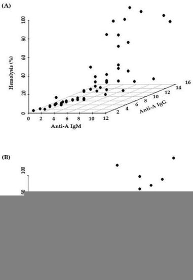 The comparison of hemolysis (%) and ABO Ab titers, such as anti-A IgM, anti-A IgG, anti-B IgM, and anti-B IgG, is summarized in Figure 2.