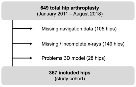 - Ybinger, T.; Kumpan, W.; Hoffart, H.; Muschalik, B.; Bullmann, W.; Zweymüller, K. Accuracy of Navigation-Assisted Acetabular Component Positioning Studied by Computed Tomography Measurements: Methods and Results. J. Arthroplast. 2007, 22, 812–817. [Google Scholar] [CrossRef] [PubMed]