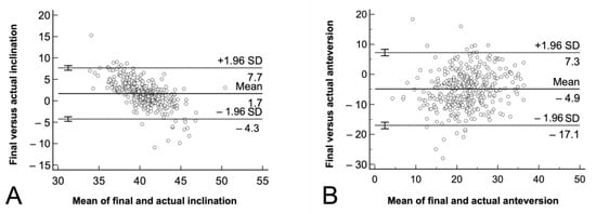 - Sendtner, E.; Schuster, T.; Wörner, M.; Kalteis, T.; Grifka, J.; Renkawitz, T. Accuracy of acetabular cup placement in computer-assisted, minimally-invasive THR in a lateral decubitus position. Int. Orthop. 2010, 35, 809–815. [Google Scholar] [CrossRef][Green Version]