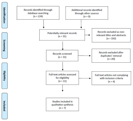 Final literature search performed on 31 January 2022 identified 224 studies of potential interest (Figure 1). Analysis involved all 224 studies: out of them, 193 ones turned out as not relevant for title and abstract, while 31 full-texts were considered eligible. Twenty of the 31 studies were excluded because they were identified as duplicate publications. After removal of 4 studies not complying with inclusion criteria (1 robotic gastrectomy versus open gastrectomy meta-analysis; 1 umbrella review; 1 umbrella review protocol; 1 network meta-analysis), 7 meta-analyses underwent qualitative synthesis [14,15,16,17,18,19,20]. No additional record was found through other source (References list). According to the AMSTAR-2 tool, we identified 5 low quality and 2 high quality studies.