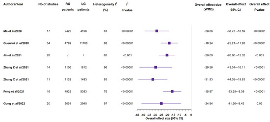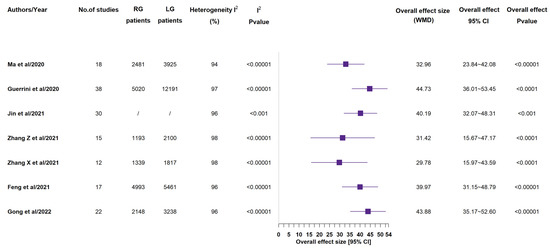 According to all included meta-analyses, operative time (Figure 2) was longer in RG group than in LG one [12,13,14,15,16,17,18]. In all 7 studies, this result had statistical significance [14,15,16,17,18,19,20]. All included meta-analyses reported lower estimated blood loss (Figure 3) in RG group than in LG one: also in this case, all 7 studies gave statistical significance to such a result [14,15,16,17,18,19,20]. Just 3 studies out of the 7 ones reported that rate of conversion to open surgery (see Supplementary Materials-Table S1) showed no statistically significant difference between the two groups [15,16,19].