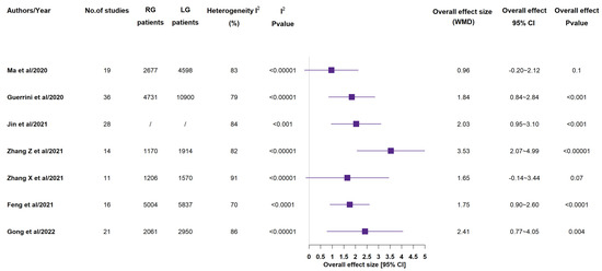 Taking into account histological parameters, all included meta-analyses recorded the number of retrieved lymph nodes (Figure 4) [14,15,16,17,18,19,20]. In 5 studies out of the 7 ones, RG group showed a statistically significant higher number of retrieved lymph nodes, in comparison to LG group [15,16,17,19,20]. With the exception of Zhang X et al.’s paper, meta-analyses reported length of proximal and distal resection margins [14,15,16,17,19,20]. In none of the included studies, the proximal resection margin length (see Supplementary Materials-Table S2) showed a statistically significant difference between the two groups, while 2 out of the 6 included studies recorded a statistical more significant distal resection margin length (see Supplementary Materials-Table S3) in the RG group in Jin et al.’s study and in the LG group in Zhang Z et al.’s study [12,13,14,15,17,18].