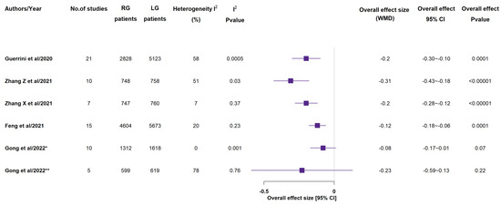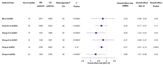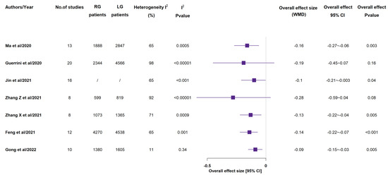 All included meta-analyses reported time to first flatus (Figure 5) and 4 of them recorded a statistically shorter time in RG group than in LG one [14,15,16,17,18,19,20]. Moreover, 4 meta-analyses out of the 5 ones, that reported time to restart oral intake (Figure 6), detected a statistically significant shorter time in RG group than in LG one [15,17,18,19,20]. With the exception Jin et al.’s paper, 6 meta-analyses reported length of hospitalization (Figure 7) [14,15,17,18,19,20]. 3 out of 6 studies showed statistically significant shorter length of hospitalization in RG group than in LG one [17,19,20].