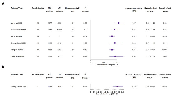 Overall complications rate. RG = Robotic gastrectomy; LG = Laparoscopic gastrectomy; OR = odds ratio (A); RR = risk ratio (B) [14,15,16,17,18,19,20].