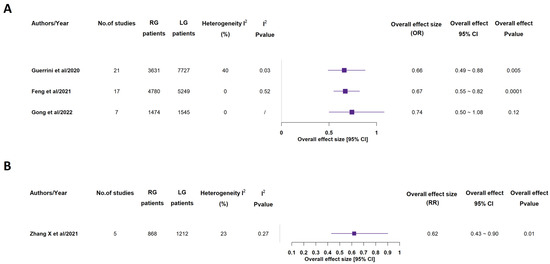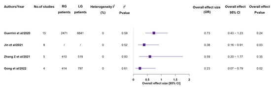 All included meta-analyses recorded overall complications (Figure 8) and mortality rates (see Supplementary Materials-Table S4) [14,15,16,17,18,19,20]. 3 out of the 7 studies found a statistically significant lower overall complication rate in RG group, while all studies did not find any significant discrepancy between the two groups, in terms of mortality rate [14,15,16,17,18,19,20].