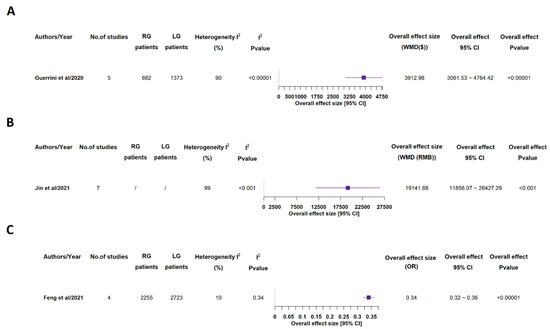 Costs. RG = Robotic gastrectomy; LG = Laparoscopic gastrectomy; WMD = weighted mean difference; $ = US dollars (A); RMB = People’s Republic of China renminbi (B); OR = odds ratio (C) [15,16,19].