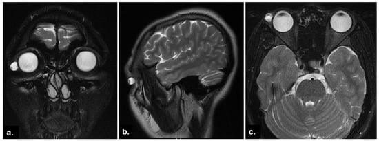 Orbital magnetic resonance images (T2-weighted). (a) The coronal image showed a well-defined periocular lesion adjacent to the lacrimal gland; (b) sagittal and (c) axial images revealed the distinct air-fluid level within the lesion.