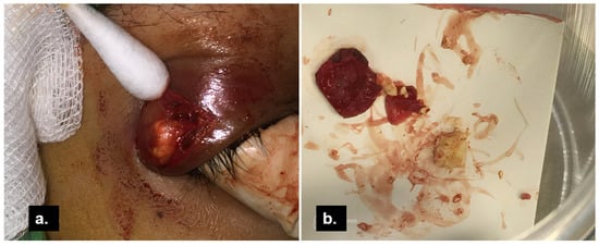 - Suimon, Y.; Kase, S.; Ishijima, K.; Kanno-Okada, H.; Ishida, S. Clinicopathological features of cystic lesions in the eyelid. Biomed. Rep. 2019, 10, 92–96. [Google Scholar] [CrossRef] [Green Version]