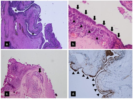 Histopathology of the apocrine hidrocystoma. (a) Microscopically, multilocular cystic lesions lined with bilayered cells were seen (asterisk) (hematoxylin–eosin, original magnification ×40). (b) Apocrine cells formed the epithelium (arrow), and focal inflamed stroma showed lymphoplasmacytic infiltration (arrowhead) (hematoxylin–eosin, original magnification ×100). (c) One lobule of the sebaceous gland (arrow) in the cyst wall (hematoxylin–eosin, original magnification ×40). (d) The lining cells showed GCDFP-15 positivity (arrowhead), a marker of apocrine epithelium.