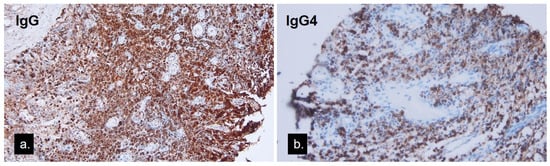 (a) Immunohistochemical stain of the lesion using an anti-IgG antibody (b) and anti-IgG4 antibody showing the high ratio of IgG4-positive cells against IgG-positive cells exceeding 40%.