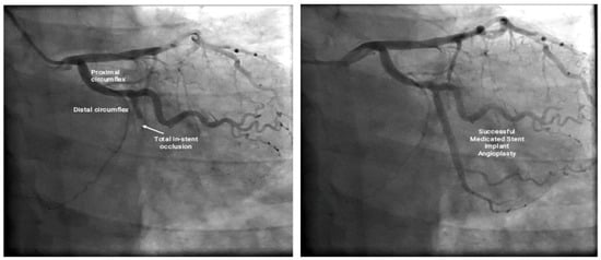 Coronary arteriography showing complete thrombotic stent occlusion in the circumflex artery (left), and successful posterior placement of a medicated stent in the circumflex artery (right).
