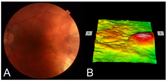 Color fundus photography (A) of the left eye showing chorioretinal atrophy induced by brachytherapy in the temporal part of the fundus; macular thickness map (B) showing macular edema (particularly in the temporal part of the macula).