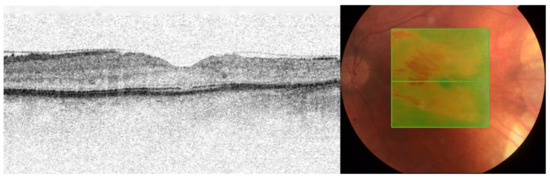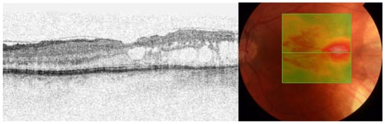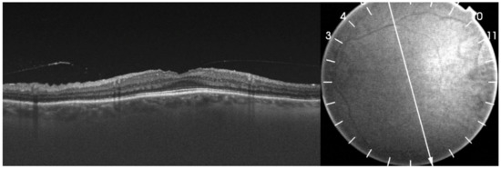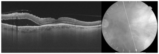 A 43-year-old man with a childhood history of bilateral retinoblastoma (Figure 1), enucleation of the right eye, and two sessions of brachytherapy with cobalt-60 in the left eye (with the subsequent five sessions of xenon photocoagulation) presented with symptoms of blurred vision. His best corrected visual acuity (BCVA) was 0.2 by Snellen chart, and the intraocular pressure was normal. A slit-lamp examination of the anterior segment revealed early corticonuclear cataract. Posterior-segment examination revealed macular edema with radiation retinopathy and multiple chorioretinal scars after laser photocoagulation. There were no signs of inflammation in the anterior segment of the left eye. Fundus examination by indirect ophthalmoscopy revealed no soft exudates or retinal hemorrhages (Figure 2A). Optical coherent tomography (OCT) showed macular edema in the right eye (Figure 2B and Figure 3). Fluorescein angiography report described a hyperfluorescent area on the temporal side of the fovea of the left eye, but there were no nonperfusion areas or signs of vasculitis. The patient had no history of hypertension or diabetes and did not use any medications that could induce macular edema. Therefore, we assumed that the macular edema was caused by previous radiation therapy. Based on literature data, we used anti-vascular endothelial growth factor (VEGF) agents as the first-line approach [11,12]. Moreover, considering that our patient had only one eye, we decided on anti-VEGF therapy to avoid complications such as secondary cataract or glaucoma. It was reported that up to four injections of an anti-VEGF agent at intervals of 1 month improve macular edema and BCVA in patient with radiation maculopathy [13]. Therefore, we administered three intravitreal injections of bevacizumab (1.25 mg/0.05 mL). However, no functional and clinical improvement was achieved. Therefore, the anti-VEGF therapy was switched to intravitreal TA injections (4 mg/0.1 mL). During the four-year follow-up, the patient received eight TA intravitreal injections. No increase in intraocular pressure was observed after any of the intravitreal TA injections. Each injection led to transient functional improvement. OCT showed a significant reduction in central retinal thickness and resolution of macular edema (Figure 4). BCVA improved to 0.6. During that time, the patient underwent a phacoemulsification of cataract with intraocular lens implantation and yttrium-aluminum-garnet (YAG) laser posterior capsulotomy due to posterior capsule opacification.