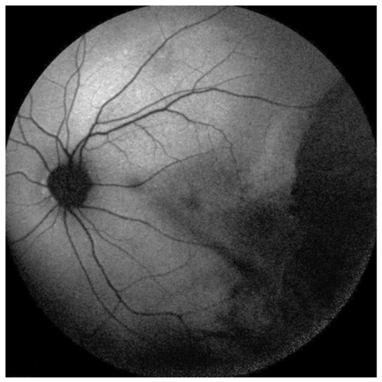 Fundus autofluorescence of the left eye showing the area of hypoautofluorescence in chorioretinal scars induced by brachytherapy as well as the area of hyperautofluorescence in the superior temporal vascular arcades due to subretinal fluid.