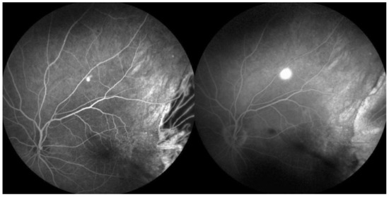 The available clinical experience suggests that steroid treatment should be administered with caution not only in patients with retinal pigment epithelial detachment and increased choroidal thickness [18]. In our case, clinical examination and OCT were challenging due to radiation cataract, insufficient pupillary response to mydriatics, brachytherapy complications, and scarred chorioretinal lesions after photocoagulation for retinoblastoma, but fluorescein angiography proved to be crucial in establishing the correct diagnosis.