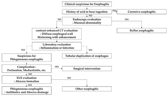 - Woo, W.G.; Do, Y.W.; Lee, G.D.; Lee, S.S. Phlegmonous Esophagitis Treated with Internal Drainage and Feeding Jejunostomy. Korean J. Thorac. Cardiovasc. Surg. 2017, 50, 453–455. [Google Scholar] [CrossRef] [PubMed]