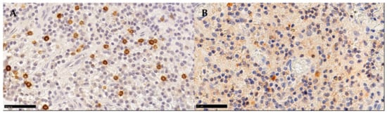 Immediately after surgery, the 2 × 3 mm biopsied specimens were immersion-fixed in 4% formalin/0.1 M phosphate-buffered saline (PBS) (pH 7.4) for 24 h at room temperature, then routinely dehydrated in increasing concentrations of ethanol (from 50 to 100%) and xylol and finally embedded in paraffin. Serial 4–5 µm buccal–lingual sections were obtained, mounted on 3-amino-propyl-trietoxi-xilane-coated slides, then hydrated in decreasing concentrations of xylol and ethanol (from 100 to 70%) and finally immersed in distilled water. The sections were stained with haematoxylin and eosin (HE) to evaluate the tissue morphology. For the immunohistochemical evaluation, the following markers were chosen according to previous studies [,] (Table 1): CD3+ (F7.2.38, NeoMarkers, ThermoFisher Scientific, Monza, Italy) for T lymphocytes, CD4+ (1F6, NovoCastra, Leica Biosystem, Milano, Italy) for T helper lymphocytes, CD8+ (C8/144B, DAKO, Agilent Technologies Italia S.p.A., Cernusco sul Naviglio, Italy) for T cytotoxic lymphocytes, CD15+ (C3D-1, DAKO, Agilent Technologies Italia S.p.A., Cernusco sul Naviglio, Italy) for neutrophils, CD20+ (L26, DAKO, Agilent Technologies Italia S.p.A., Cernusco sul Naviglio, Italy) for B lymphocytes, CD68+ (PGM1, DAKO, Agilent Technologies Italia S.p.A., Cernusco sul Naviglio, Italy) for macrophages, and CD138+ (B-B4, DBA Italia, Segrate, Italy) for plasma cells.
