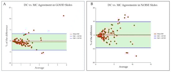 In all cases the average difference between MC and DC was offset from zero, meaning that there was a mean bias. Most of the points were within the acceptable limits of the confidence interval, suggesting that there was an agreement between both techniques despite the condition (GOOD or NOISE) of the analysed slides. In the GOOD slides group, 95% of the points were inside the confidence interval, presenting an average bias of −0.44% (Figure 2A). In the NOISE slides group, 92% of the points were inside the confidence interval, presenting an average bias of 0.25% (Figure 2B). In both plots, the data were clustered on the left and the points spread as they moved to the right, demonstrating a trend where higher values presented a higher mean bias [].
