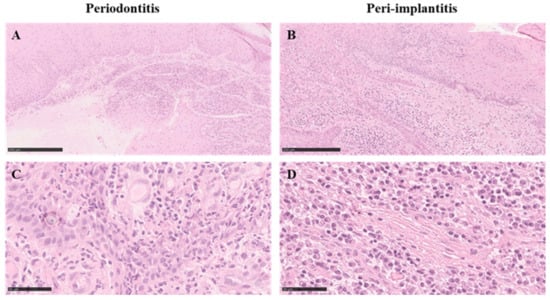 Sections of periodontitis and peri-implantitis tissues stained with HE: (A,B) low magnification; (C,D) high magnification.