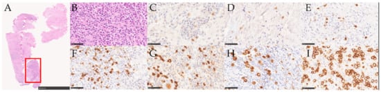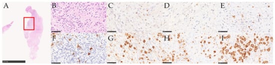 Stained samples of a PI lesion: (A) overview of a section stained with HE; (B) detailed view of (A); (C) CD3+; (D) CD4+; (E) CD8+; (F) CD15+; (G) CD20+; (H) CD68+; (I) CD138+.