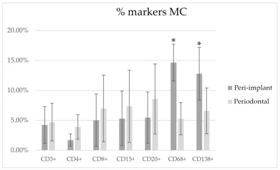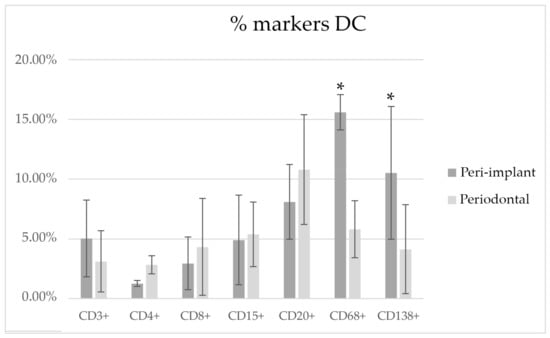 MC and DC also provided comparable also concerning the evaluation of the inflammatory patterns of PD and PI. The inflammatory markers of PD and PI soft tissues used in this study have been investigated by other researchers, and their profiles could, therefore, be compared. Our results concerning the inflammatory cell measurements of PD and PI lesions obtained by both DC and MC are similar to those previously reported in the literature []. A significant difference in CD68+ and CD138+ expression between PI and PD was evidenced, while in agreement with Gualini and Berglund (2003) [], no difference was evidenced regarding CD3+, CD4+, CD8+, and CD20+ expression levels. Concerning CD15+ expression, no statistical difference was evidenced between PI and PD lesions in the present study. De Araujo et al. (2017) [] reported a higher expression level of CD15+ in PI lesions compared to healthy peri-implant tissues. In parallel, Dutzan et al. (2016) [] reported increased levels of CD15+ in the crevicular fluid in periodontitis compared to healthy periodontal tissues.