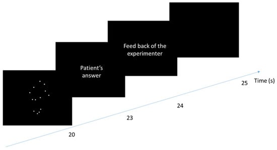 Time course of a trial of observation task for the experimental group. The patients saw on a loop (over 20 s) a PLD representing a lower human action. After that, they had 3 s to name the perceived action. When the response was correct, the experimenter said, “it is correct”, and when it was false, the experimenter gave the correct answer. The next trial started after 1 s.
