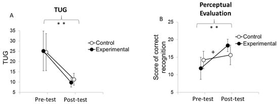 Mean results of TUG and perceptual evaluations by group before and after the rehabilitation program. Error bars represent confidence interval at 95%. ** indicates a difference between pre and post-test at p < 0.001. “+” indicates an interaction between the moment of the evaluation (pre-test, post-test) (A) and the group (control, experimental) (B) at p < 0.05. Pre-test indicates the level of performance at 0 weeks (before the rehabilitation program), and post-test indicates the level of performance at 3 weeks (at the end of the rehabilitation program).