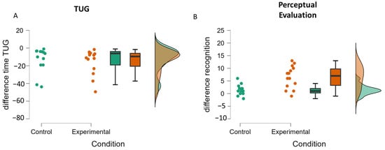 Raincloud plots of the difference between pre-test and post-test for the TUG (A) and the perceptual evaluation (B) for the control and the experimental groups.