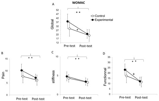 Mean results of WOMAC scores for pre-test and post-test and for the control and the experimental groups (A–D). Error bars represent confidence interval at 95%. ** indicates an effect at the moment of the evaluation at p < 0.001. + indicates an interaction between the moment of the evaluation and the condition at p < 0.05. Pre-test indicates the level of performance at 0 weeks (before the rehabilitation program), and post-test indicates the level of performance at 3 weeks (at the end of the rehabilitation program).