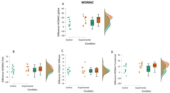 Raincloud plots of the difference (between pre-test performance and post-test performance) in WOMAC (global, pain, stiffness and functional) (A–D) for the control and the experimental groups.