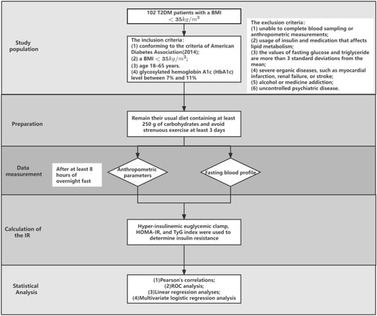 A cross-sectional study was conducted in the Department of General Surgery, Third Xiangya Hospital, Central South University (Changsha, China). One hundred and two T2DM patients with a BMI < 35 kg/m2 were prospectively consecutively recruited. The detailed steps for the search are presented in Figure 1. With the approval of the protocol by the Ethical Committee of our hospital (R19025), informed consent was signed before the study.