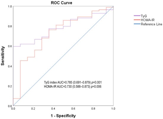 Receiver operating characteristic (ROC) analysis for HOMA-IR and TyG index in the identification of insulin resistance.