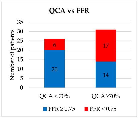 Our population included 57 patients with demographic and clinical characteristics detailed in Table 1. The procedure was technically successful in all cases, without any periprocedural complications (bleeding, coronary dissection or perforation, and renal insufficiency). Most FFR assessments were performed on the left anterior descending artery lesions (68.4%). We identified 23 (40.35%) lesions with FFR < 0.75, all of which were treated with PCI, and 34 (59.64%) lesions with FFR ≥ 0.75, of which 12 were in the “grey zone” of 0.75–0.8 and were treated with OMT. The stents used were 10 (43.5%) BMS and 13 (56.5%) DES to accommodate cancer treatment. Out of 31 patients with ≥70% stenosis as measured by QCA, 14 (45.1%) had an FFR ≥ 0.75 and lesions were reclassified as moderate and did not receive PCI or DAPT (Figure 1). By contrast, out of 26 patients with <70% stenosis as measured by QCA, 6 (23%) had an FFR < 0.75 and were reclassified as severe and were treated with PCI and the associated DAPT.