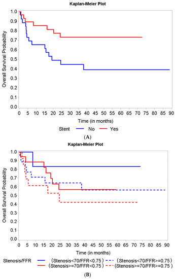 Patient characteristics are summarized by survival status along with univariate Cox regression analysis results in Table 2. At 12 months, the only borderline significant factors associated with a slightly better survival were male gender (hazard ratio (HR): 0.38, 95% CI, 0.13–1.13, p = 0.08) and receiving a stent (HR: 0.34, 95% CI, 0.10–1.09, p = 0.07). When observed for overall survival, patients who received a stent (a decision guided by FFR assessment) showed a significant association with decreased risk of all-cause death (HR: 0.37, 95% CI, 0.15–0.90, p = 0.03) (Figure 2A). We further analyzed two subgroups of the patients who did not receive a stent: those with an FFR between 0.75 and 0.8 (11 patients, 19.29%) and those with an FFR > 0.8 (23 patients, 40.35%). Overall survival was not significantly different between these two groups (HR: 0.18, 95% CI, 0.42–3.45, p = 0.73).