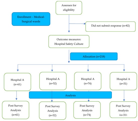 A validated cross-sectional survey, the Hospital Survey on Patient Safety Culture (HSOPSC) from the Agency for Healthcare Research Quality, was used []. The survey was conducted in the medical−surgical wards (MSW) of four hospitals in the Qassim region, Kingdom of Saudi Arabia (KSA). Using the universal sampling method, all of the qualified nursing staff in the wards were included in the research.