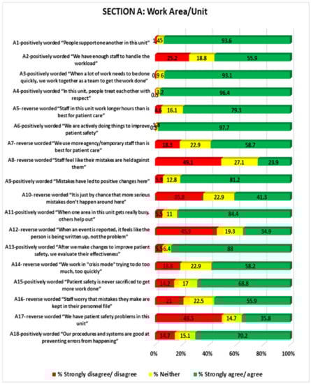 Patient safety culture has an impact on staff and patient health outcomes [,]. Many types of safety cultures exist in the workplace—reactive, proactive, positive, negative, etc. A positive culture is considered very important for the organization as it reflects the quality and effectiveness of its communication, an important tool in order to achieve patient safety goals and to prevent incidents. Communication across the organization is considered a key indicator of patient safety culture reflecting reciprocal trust, flow of information, individual perceptions regarding the importance of patient safety, institutional learning, leadership, the organization’s commitment, and the existence of an exonerating approach to incident and error reporting []. Nurses, the largest group of direct health care providers, are indispensable members of the health care system; therefore, they shoulder the responsibility of patient safety in hospitals. Just the implication of a medical error impacts the overall health care system, including nursing professionals. Measuring the existing safety culture of hospitals and the perceptions of nurses toward a safety culture enables the identification of strengths, areas for improvement, and possible interventions. This study aimed, first, to evaluate and measure the existing safety culture and safety of patients in medical−surgical wards (MSW) in hospitals located in the Qassim region, in the Kingdom of Saudi Arabia. Second, it aimed to survey the opinion of registered nurses and supervisors/managers about safety culture and issues concerned with safety in hospitals in the region.